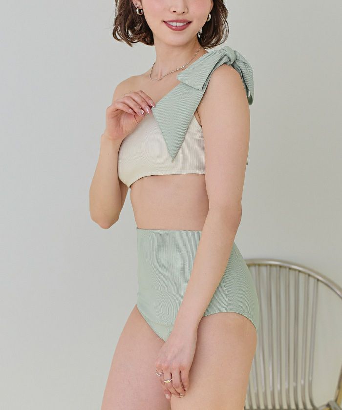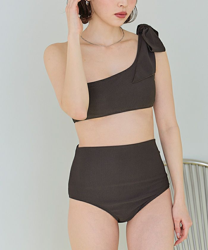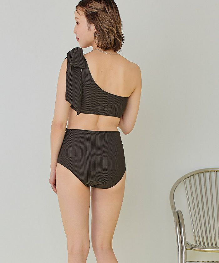 ・肩に大きなリボンを付けバランスよくワンショルダーデザインを楽しめるハイウエストビキニ。