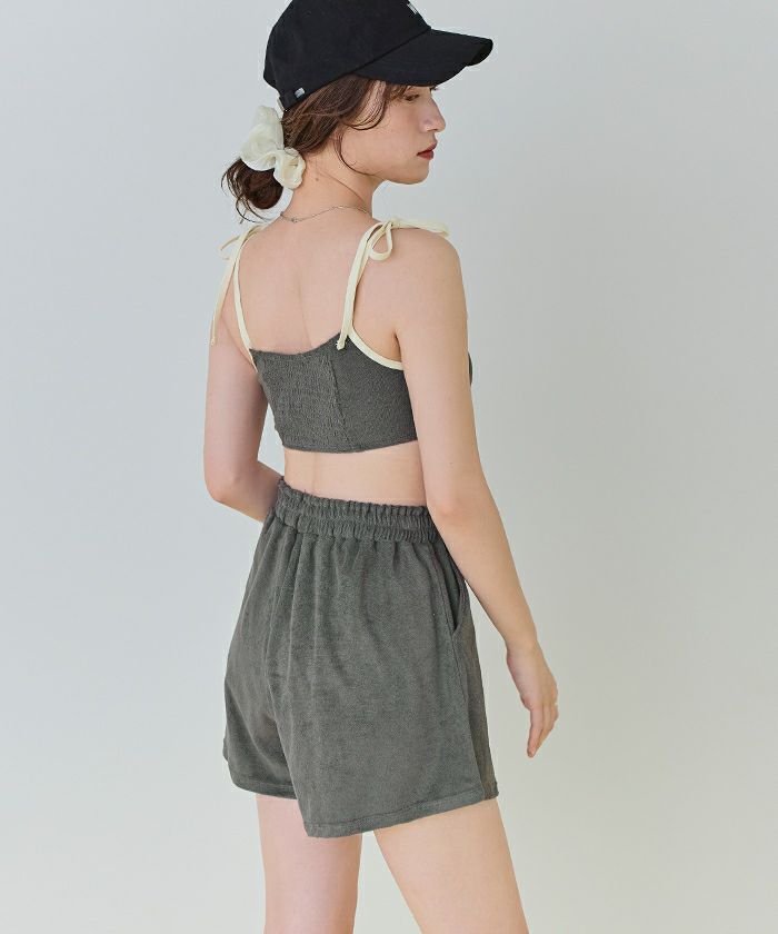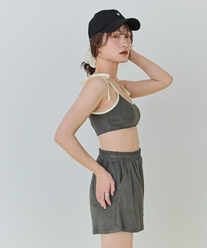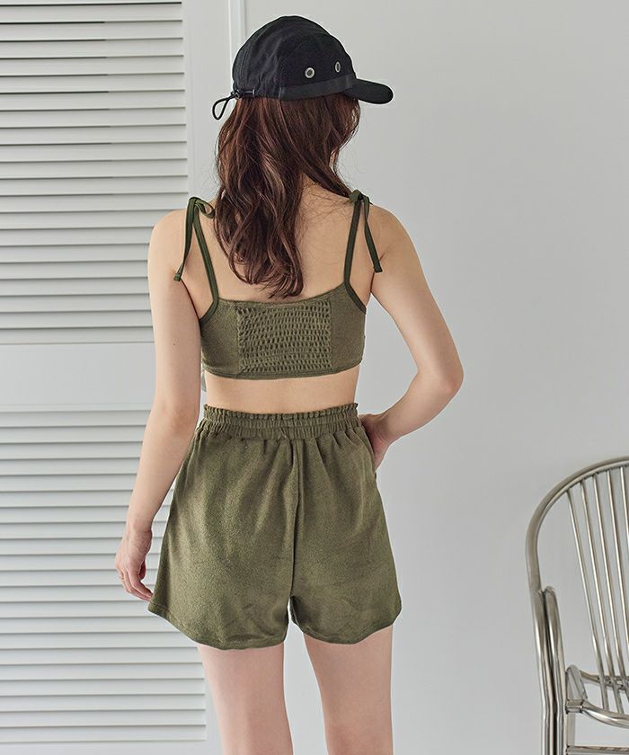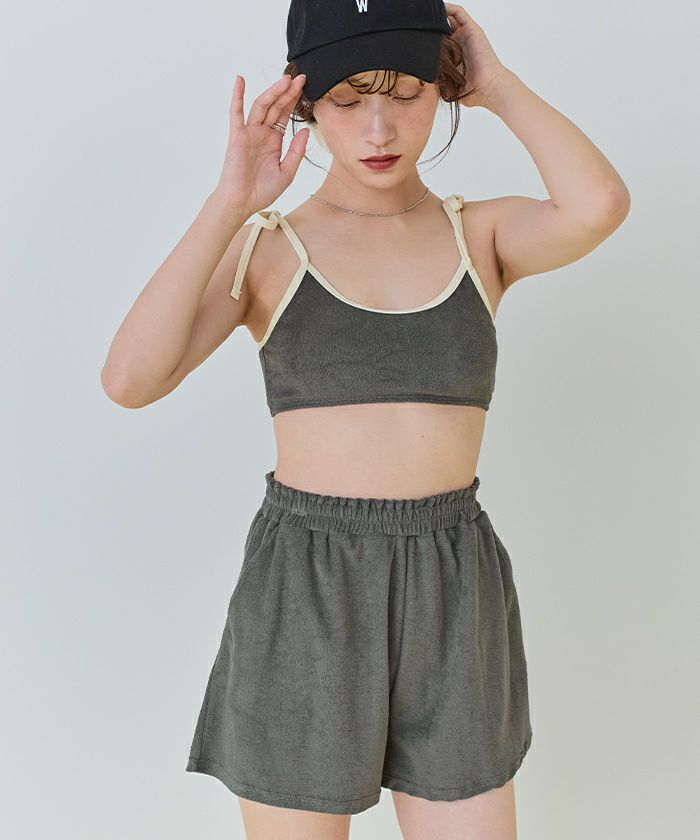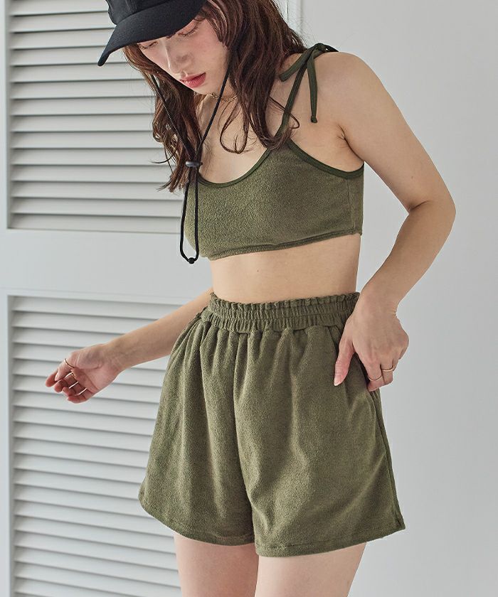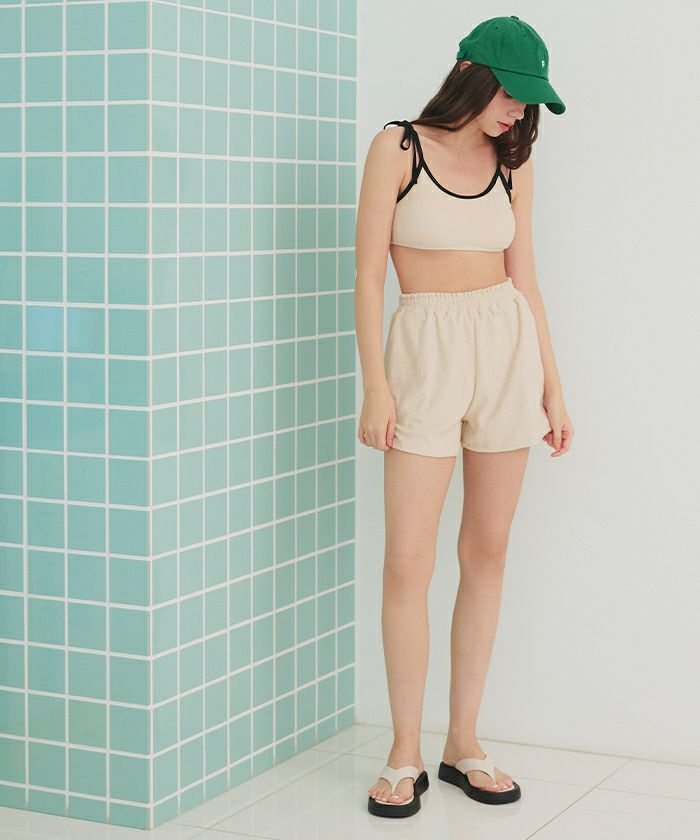 ・肌当たりの良い細かめのパイル素材のハイウエストショートパンツ。