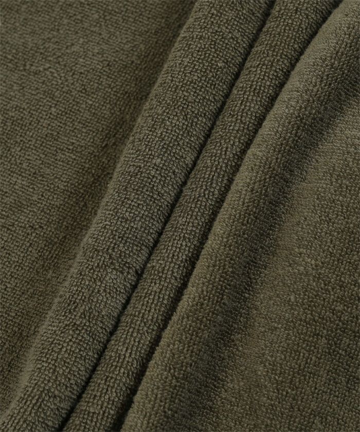 細かいパイル素材を使用している為、裁ち目から細かな繊維が出てくることがございます。繰り返しのお洗濯で解消されますので、予めご了承ください。