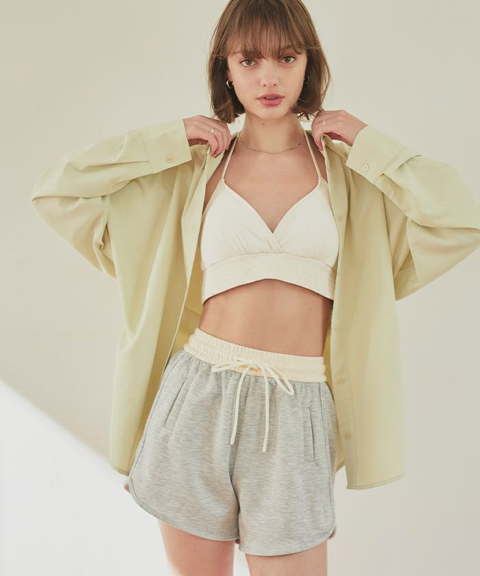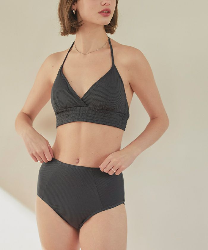 きれい見えする大人なデザインのリブ素材三角ビキニ×ハイウエストショーツ。