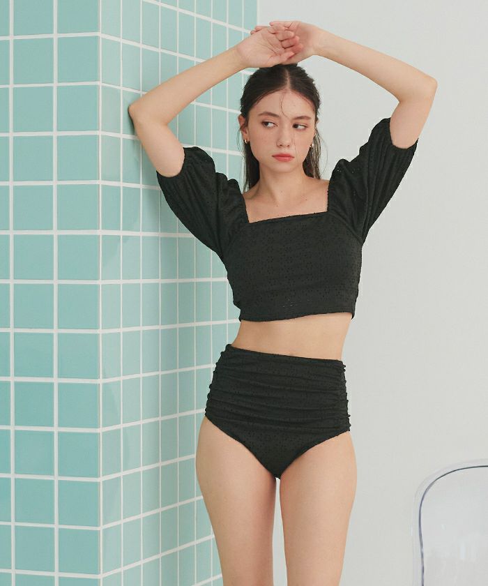 ・パフスリーブデザイン×レース素材が大人可愛いハイウエストビキニ。
