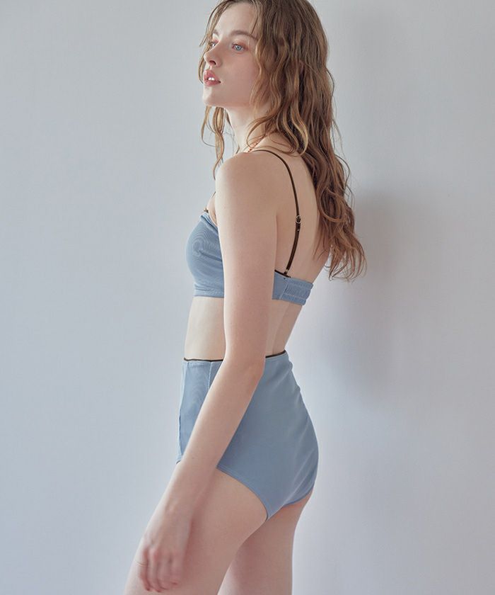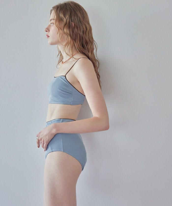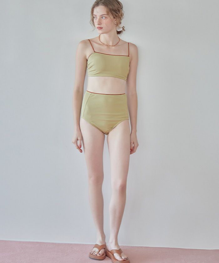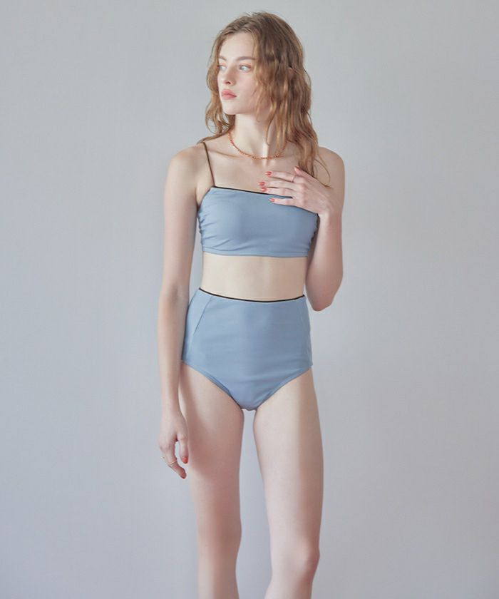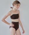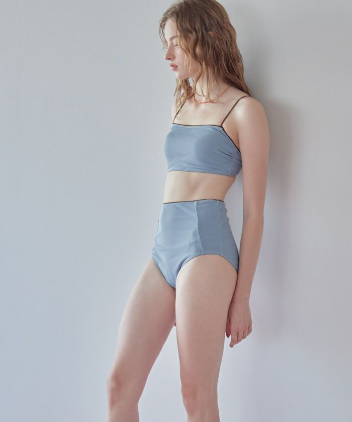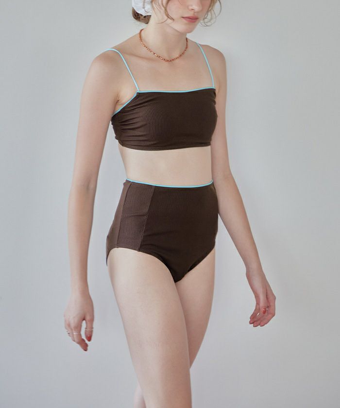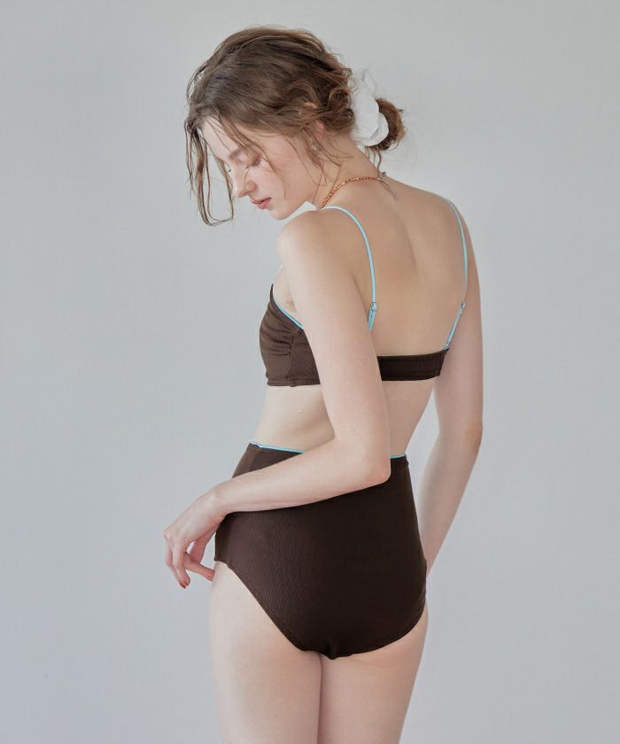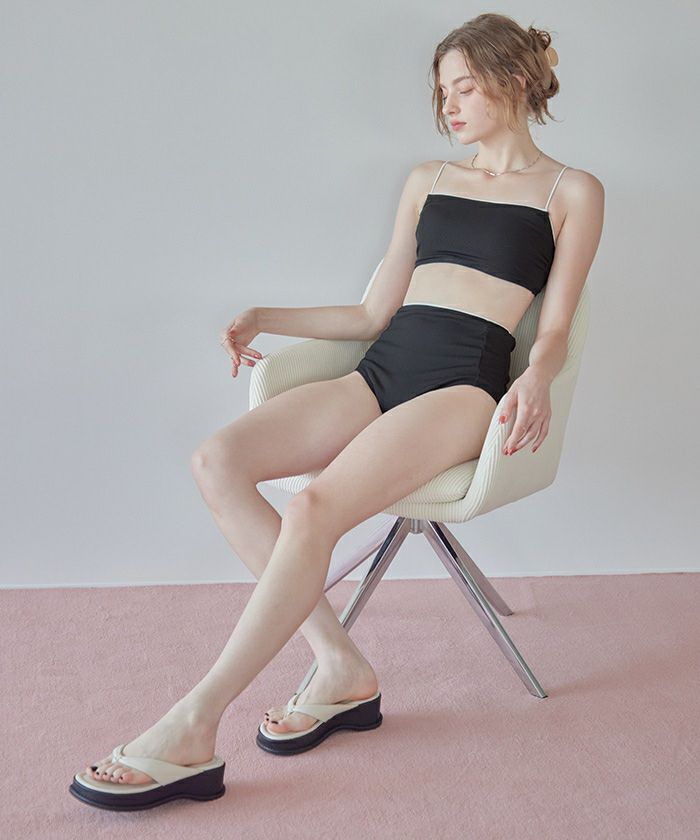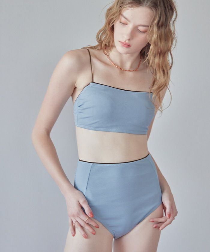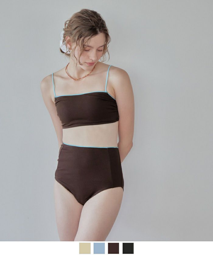 ・洗練された配色が目を引く、バイカラーデザインのハイウエストビキニ。