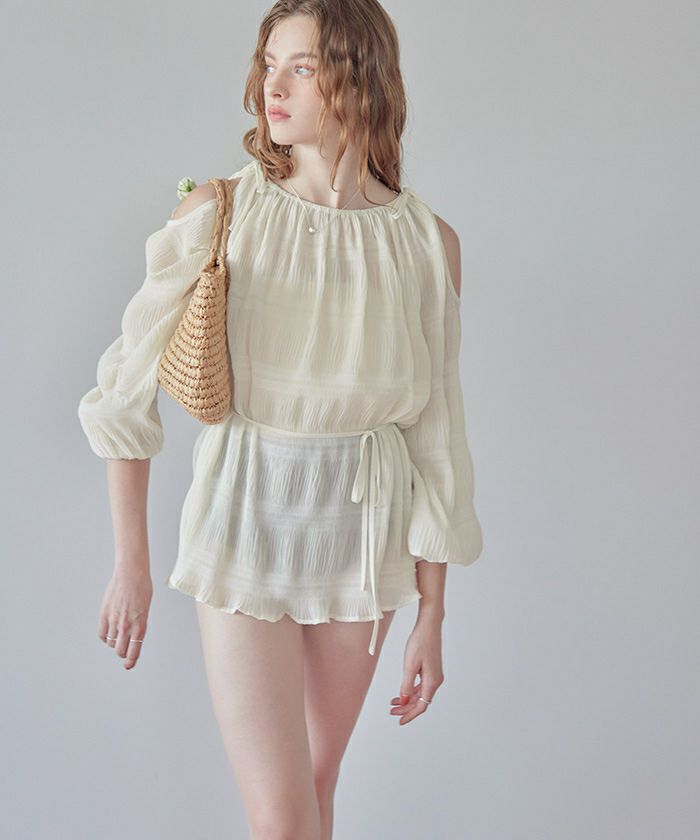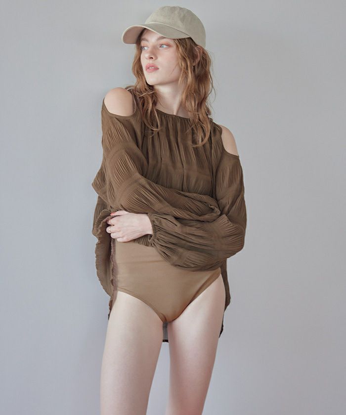 ・透け感のあるオープンショルダートップスがセットになった、大人可愛い3点セット水着。