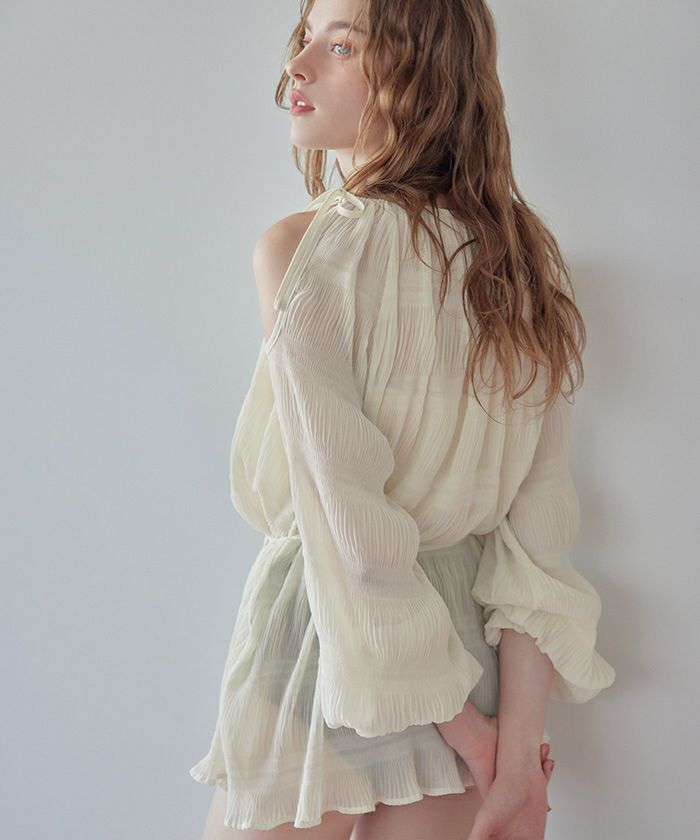 ・肩まわりをさりげなく見せるデザインで、ヘルシーな抜け感を演出。