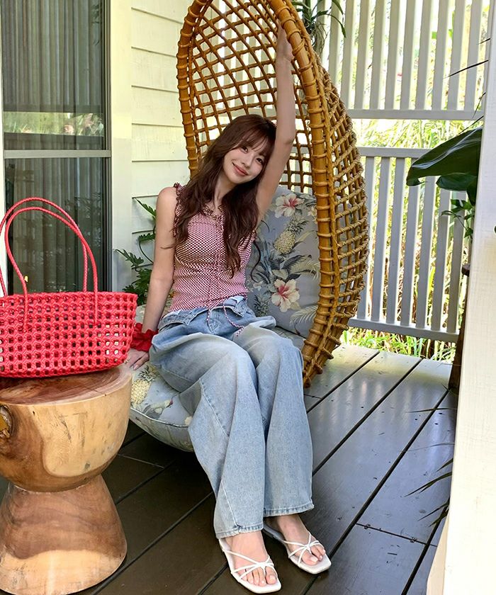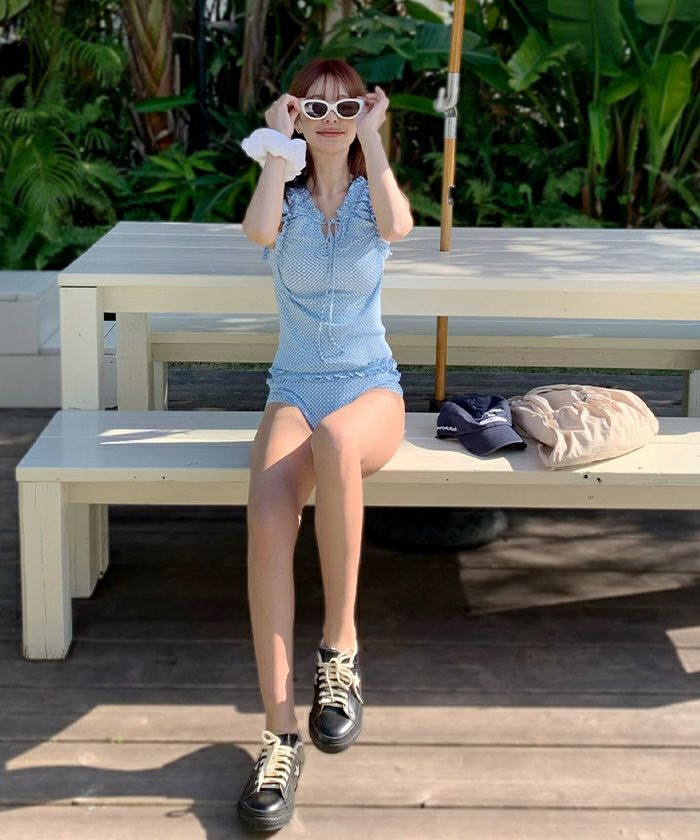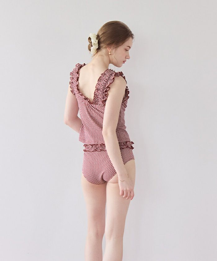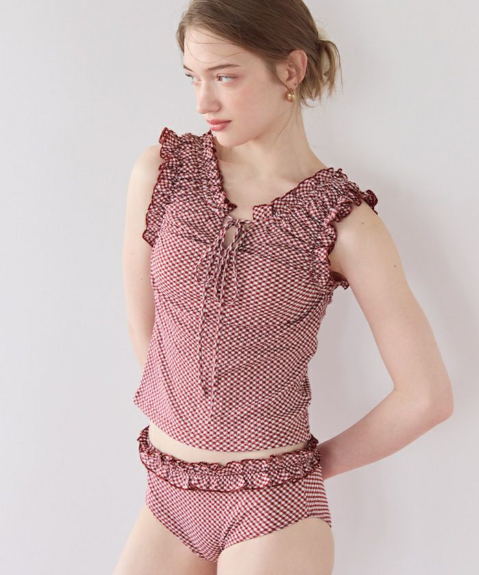 ・立体感のあるギンガム柄ジャガードを使った、フリル袖のタンクトップビキニ。