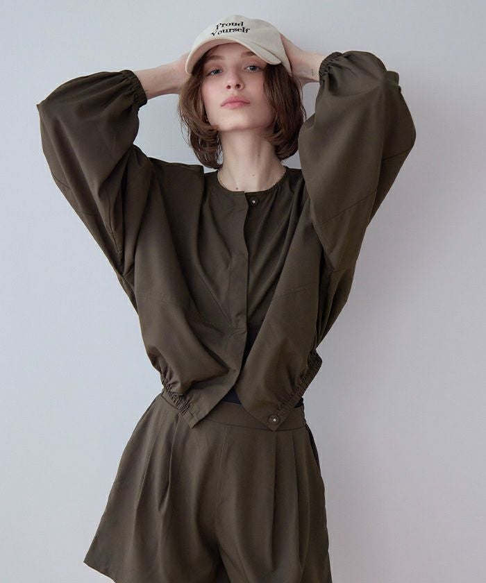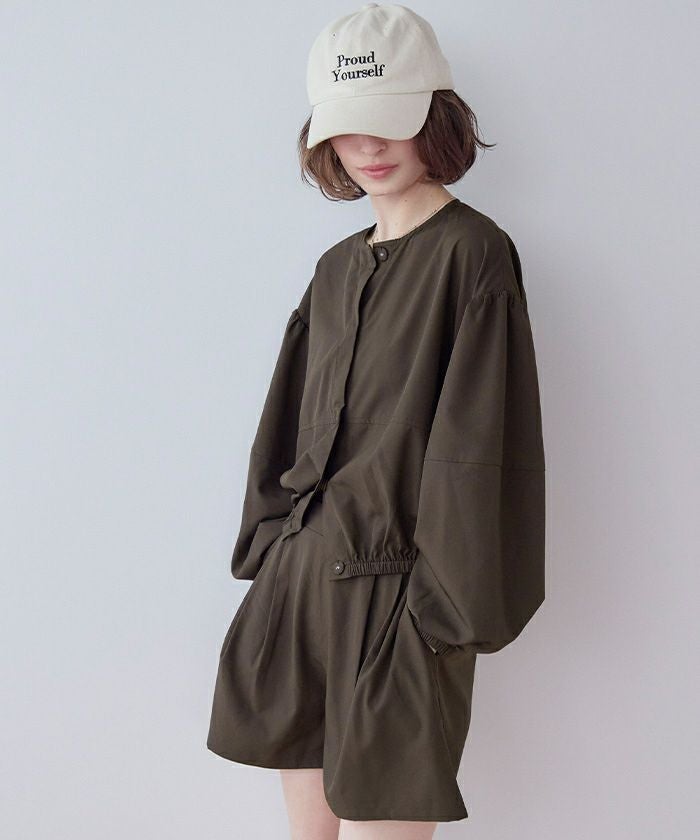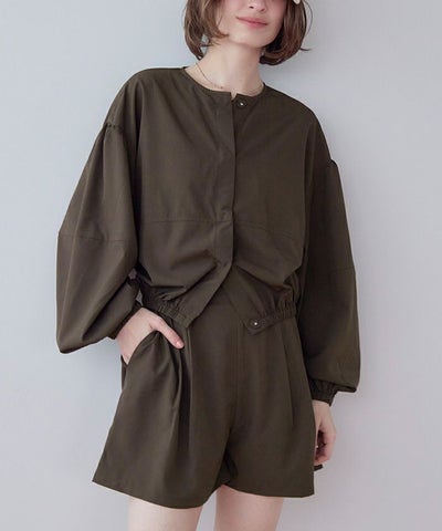 ・2点セットでコーデが完成する、ノーカラーのボリュームブルゾン×ショートパンツ。