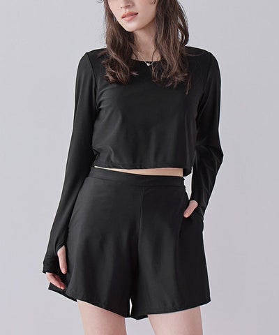 ・程よい丈感のトップスで、気になる日差し対策もしながら軽やかな印象に。