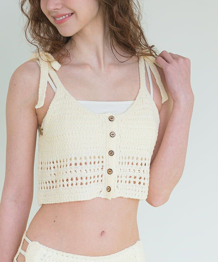 ・かぎ編みニットのショルダーリボンクロシェキャミソールが付いた3点セットビキニ。