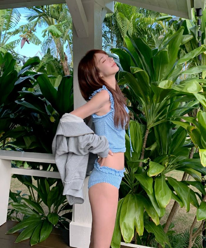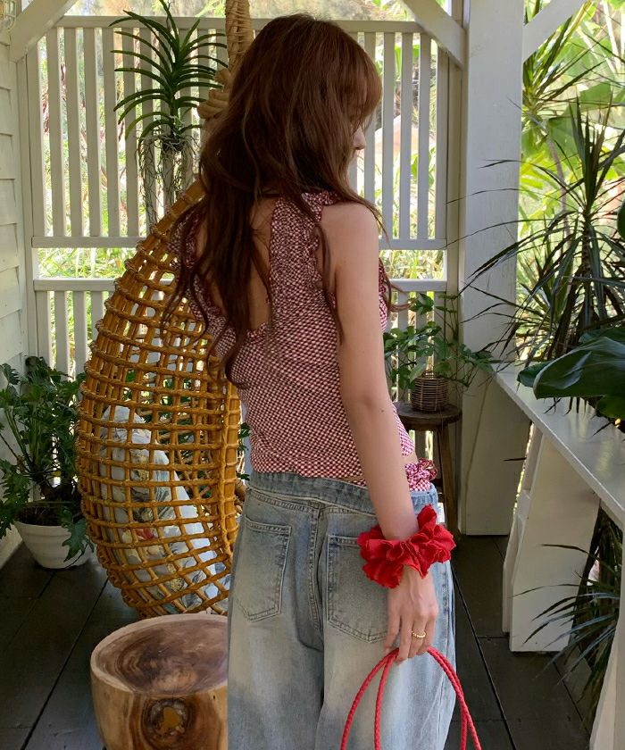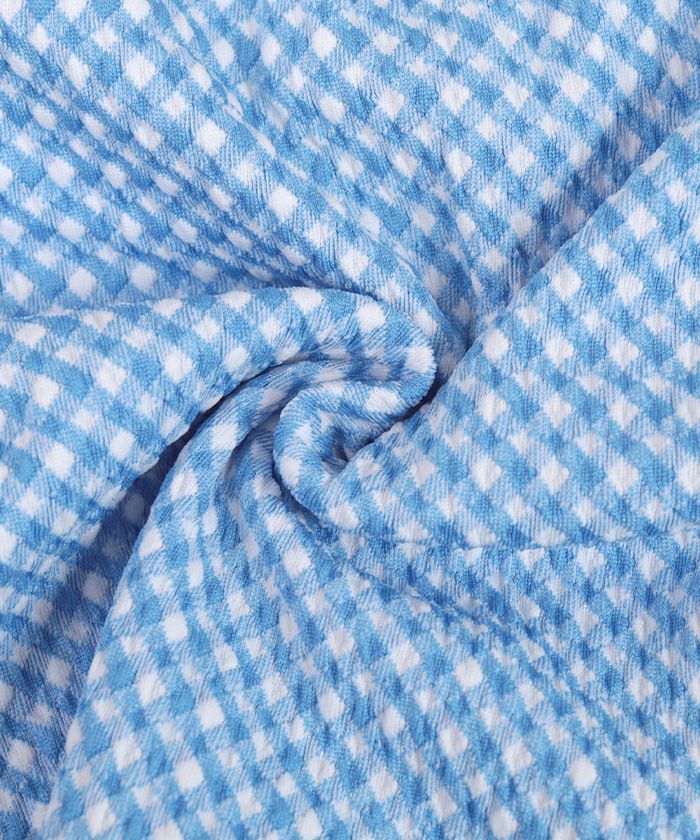 ・立体感のあるギンガム柄ジャガードを使った、フリル袖のタンクトップビキニ。