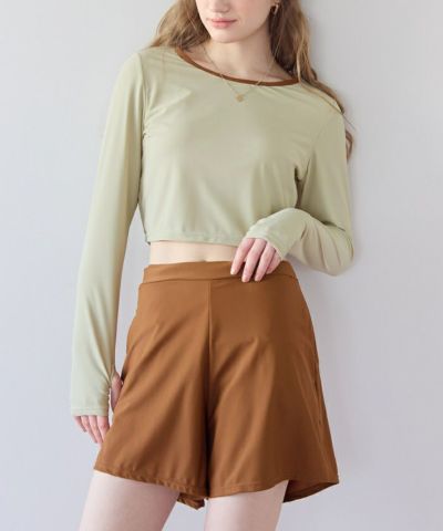 ・配色パイピングがアクセントになった長袖トップスが、洗練されたスポーティムードを演出。