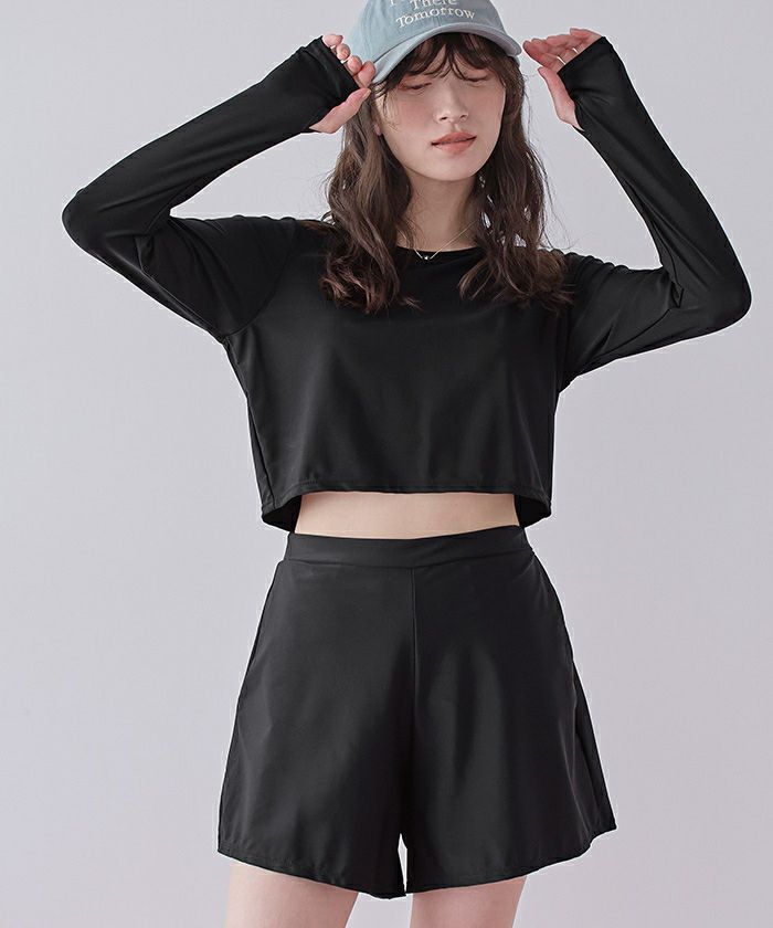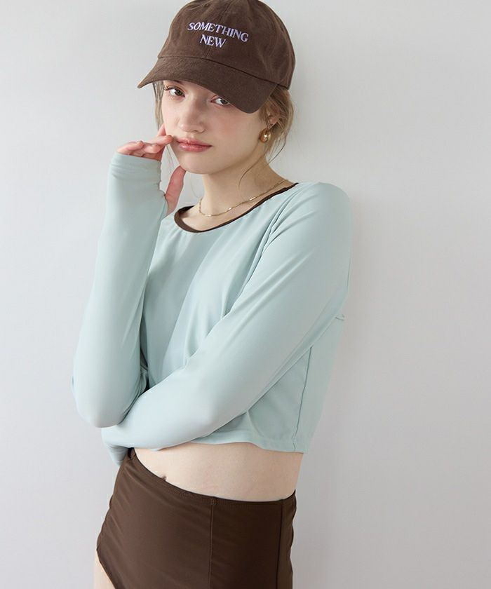 ・程よい丈感のトップスで、気になる日差し対策もしながら軽やかな印象に。