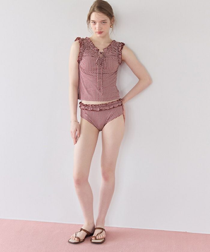 ・立体感のあるギンガム柄ジャガードを使った、フリル袖のタンクトップビキニ。