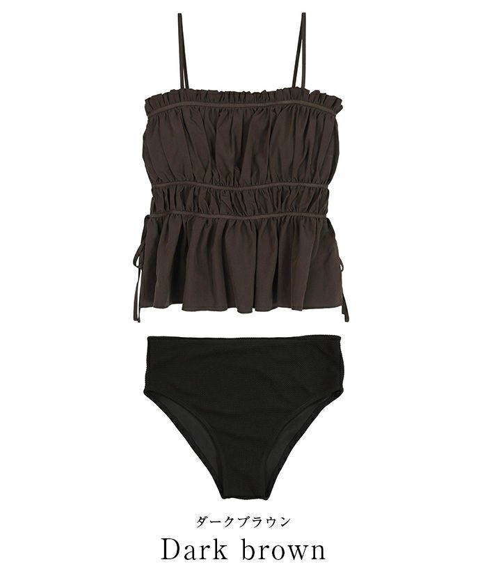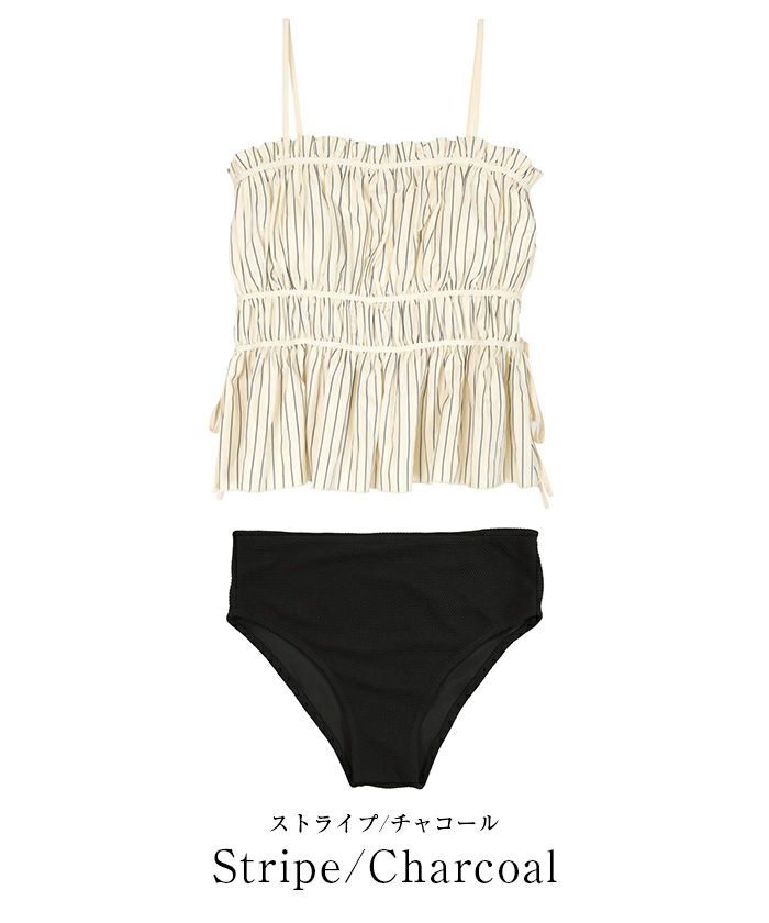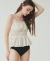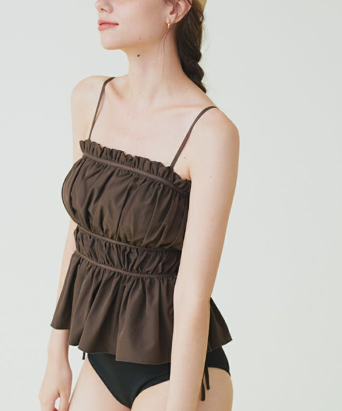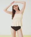 ボリュームのあるギャザーデザインが大人可愛いペプラムフレアビキニ。