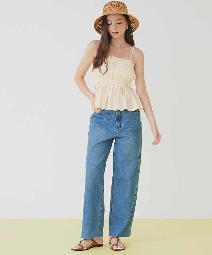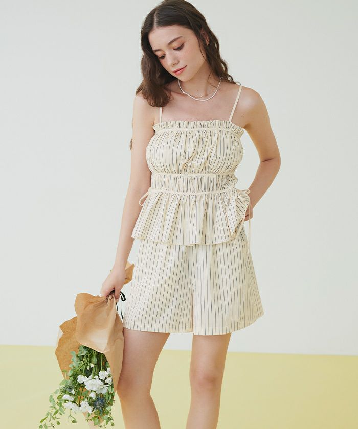 気になるウエストもおしゃれにカバーしつつ、リゾート感のあるスタイリングを叶える1着です。
