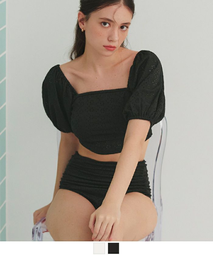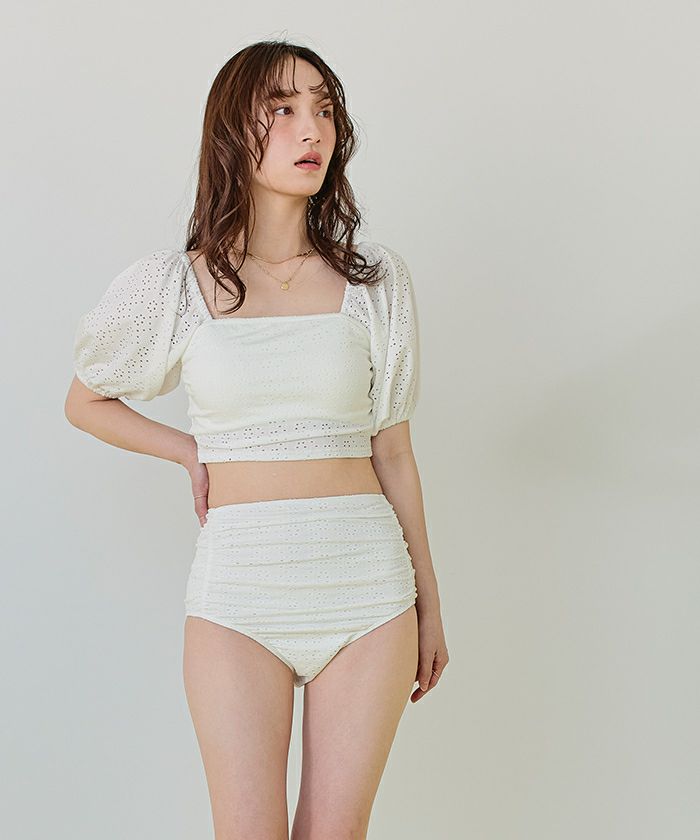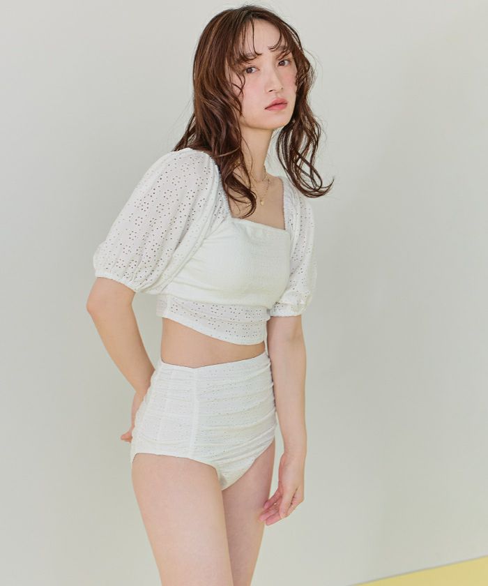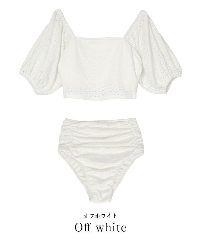 ・パフスリーブデザイン×レース素材が大人可愛いハイウエストビキニ。