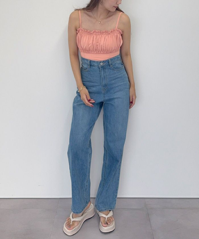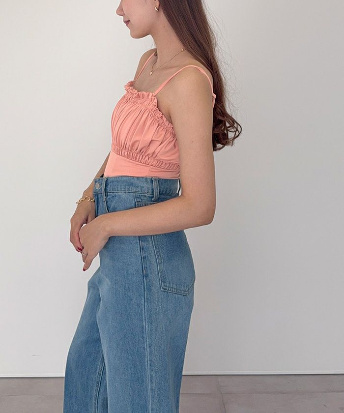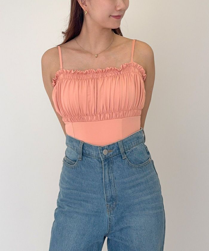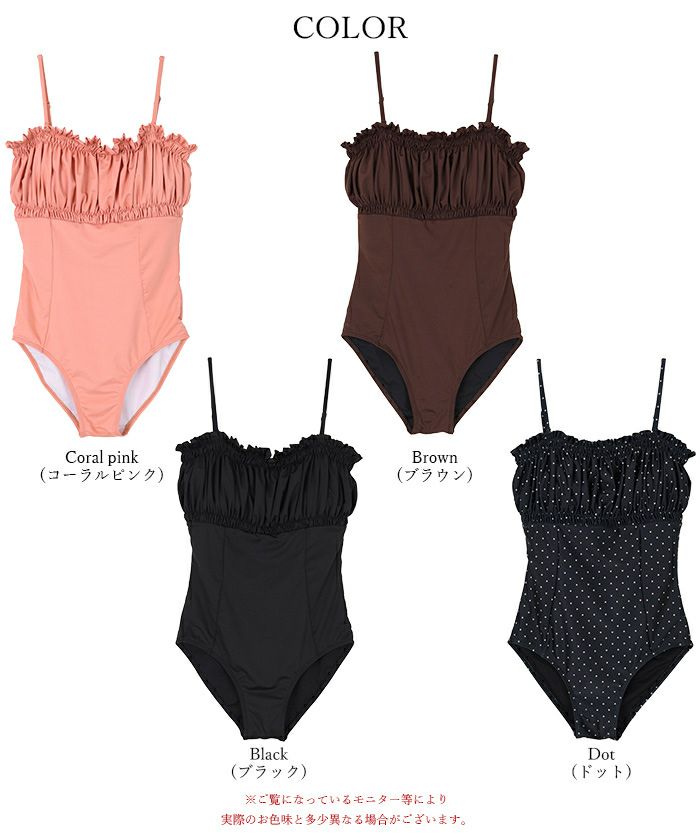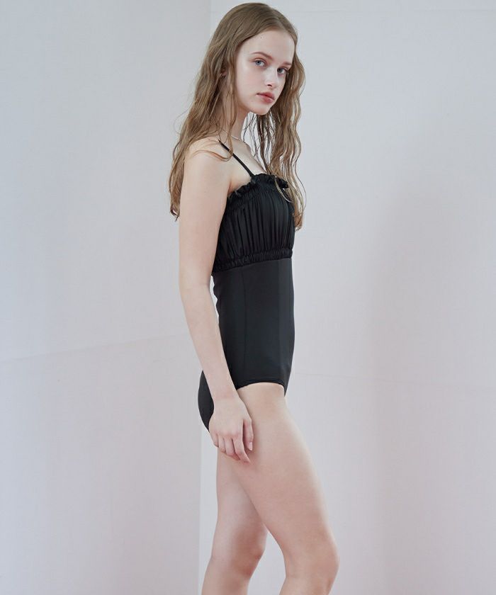 ・立体的なフリルギャザーが胸元を華やかに演出し、スタイルアップ効果も抜群。