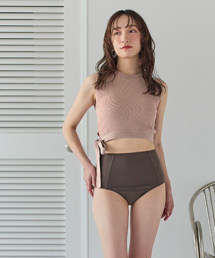 ・長めのサイドリボンがポイントのハイネックニット異素材ビキニ。