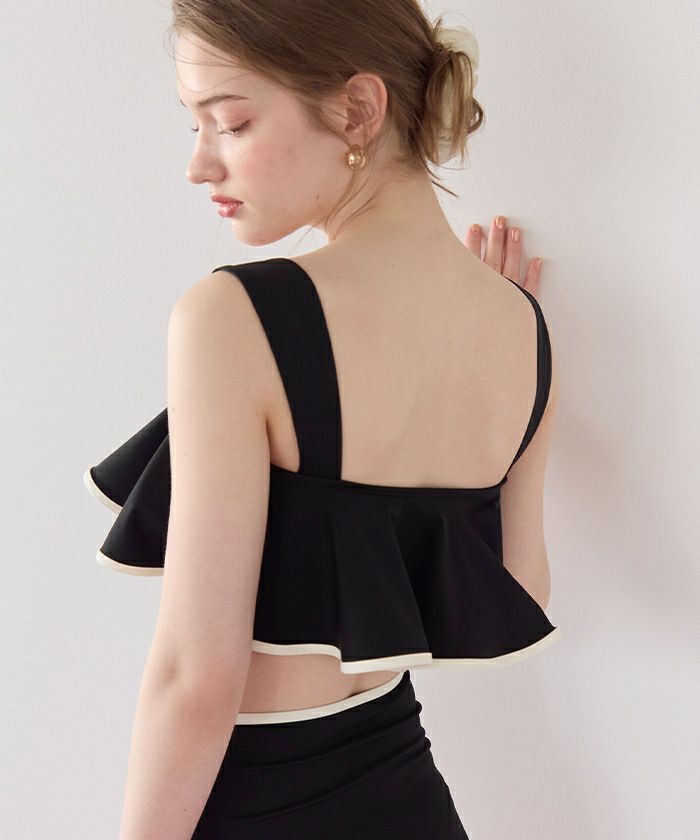 ・大きめフリルが視線を上に集めて華やかな印象を演出。