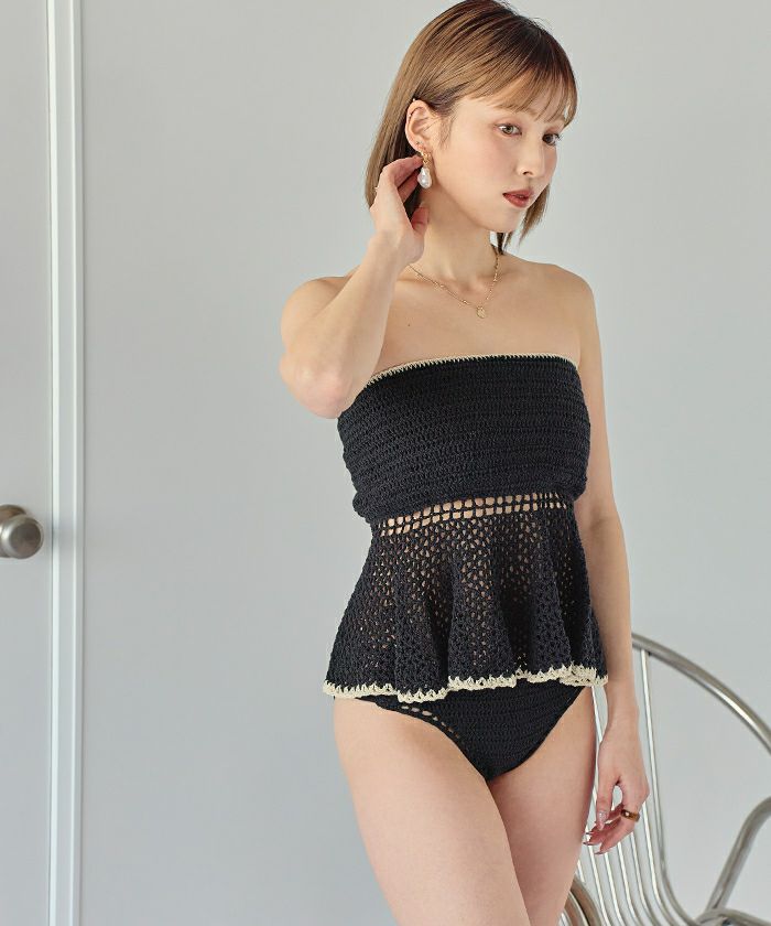 ・かぎ針編み特有の透け感が大人可愛いペプラムフレアデザインバンドゥビキニ。