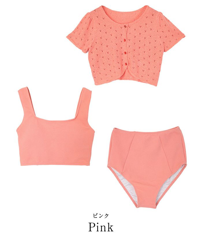 ・シンプルレース編みデザインのショートニットトップス付き3点セットビキニ。