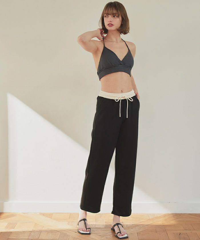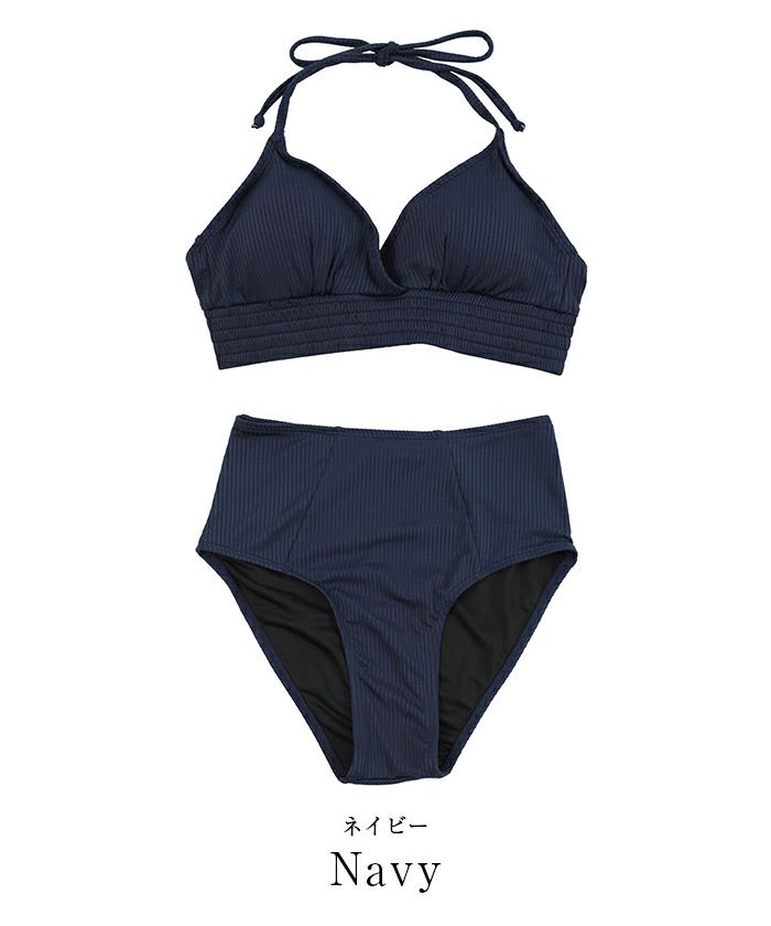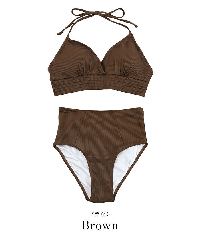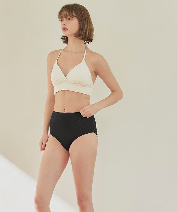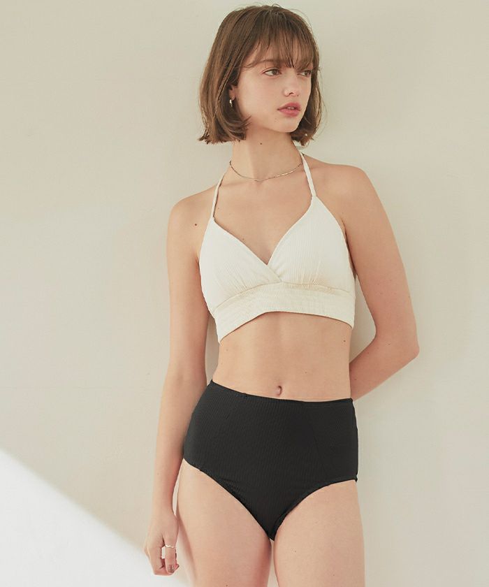 きれい見えする大人なデザインのリブ素材三角ビキニ×ハイウエストショーツ。