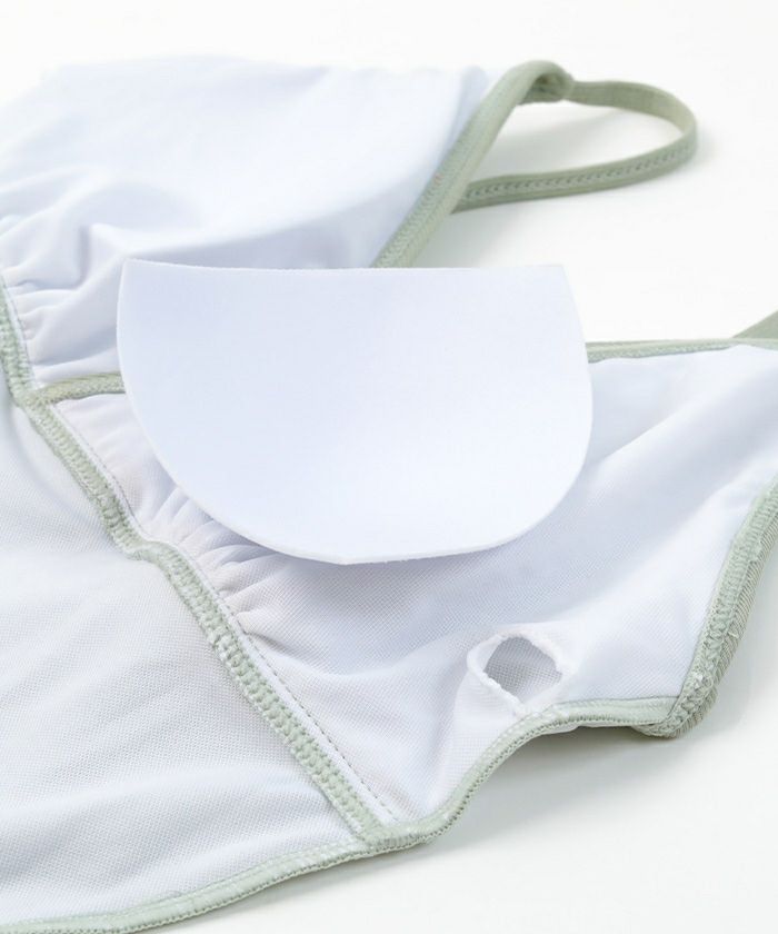 ・落ち感のある柔らかな着心地の細リブ素材。・デコルテのラインをきれいに見せVネックデザインのワンピースとフレアスカートの2点セット水着。