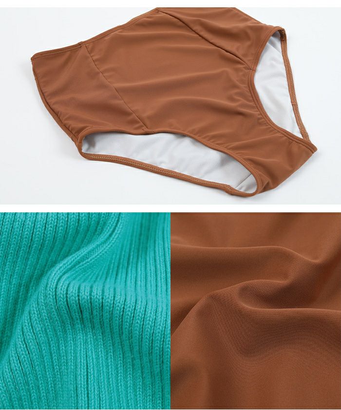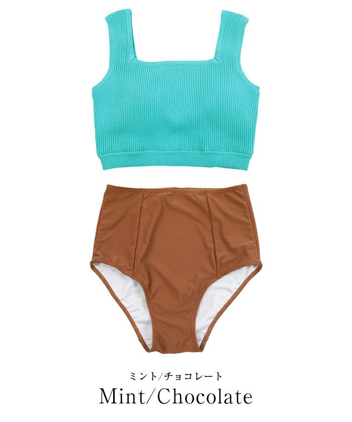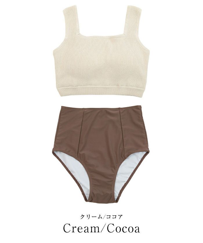 クリーム/ココアを購入しました。 クリームのトップスは、温かみのある色で、水着っぽくないニット風のリブ素材でとても可愛いです。 胸周りやお腹周りの露出が少ないので、体型に自信がない私でも、1枚で着られそうだと思いました。