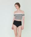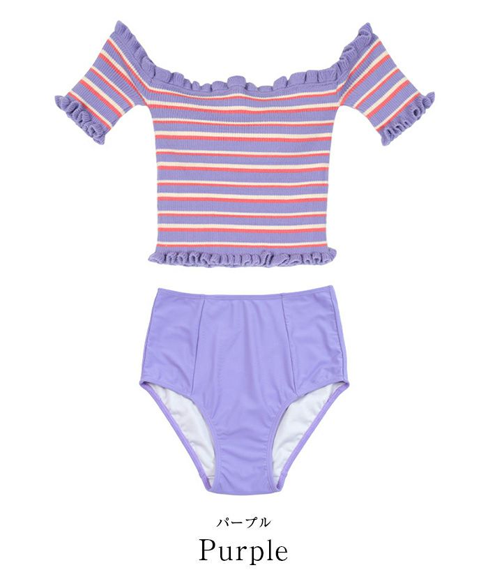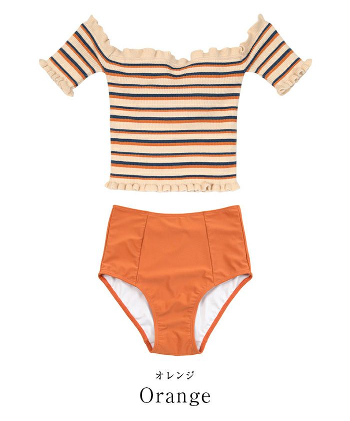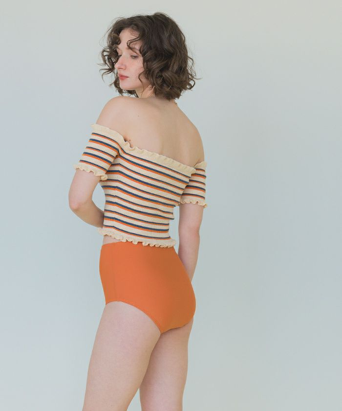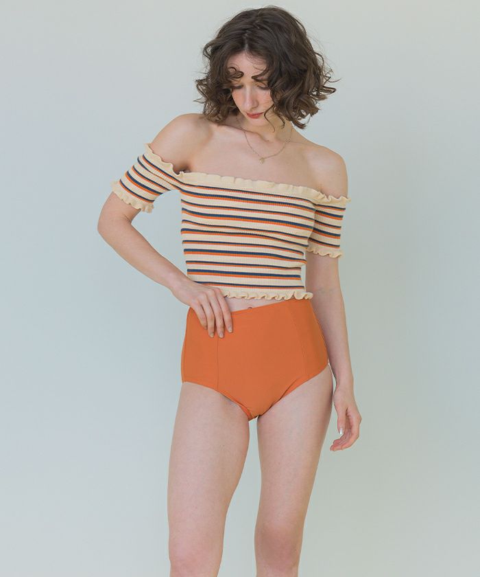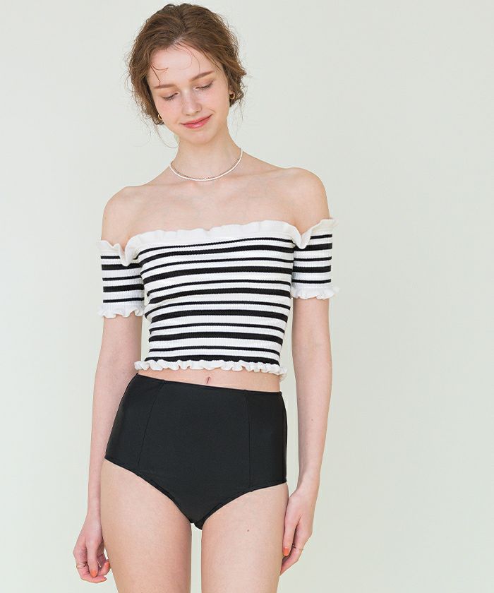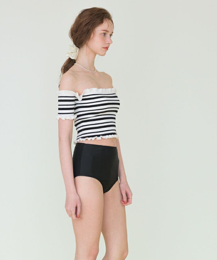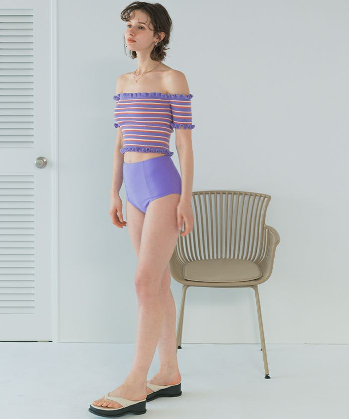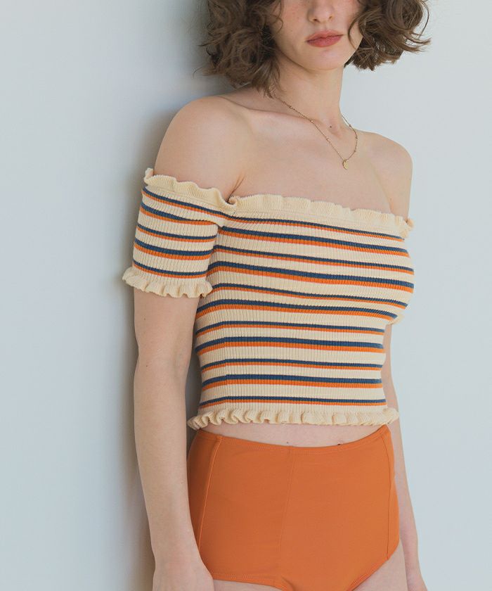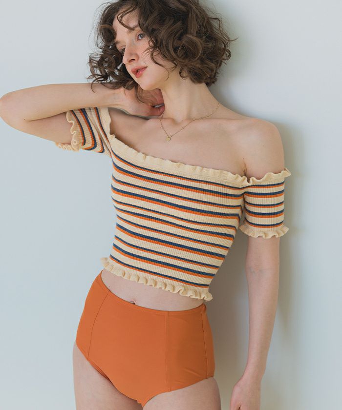 ・リブニット素材のオフショルダートップスデザインビキニ。