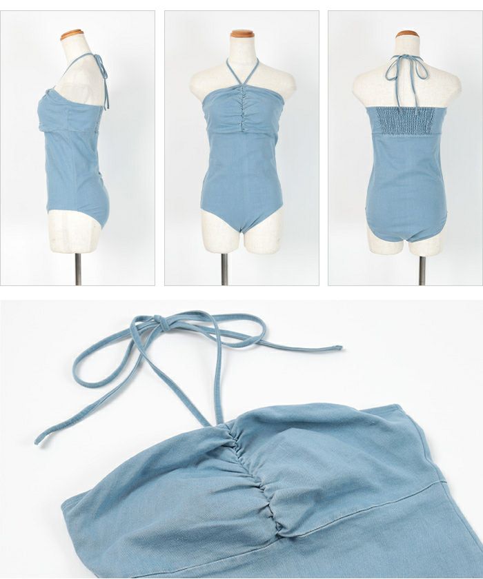 ・伸縮性の高いデニム素材のフロントギャザーデザインワンピース。