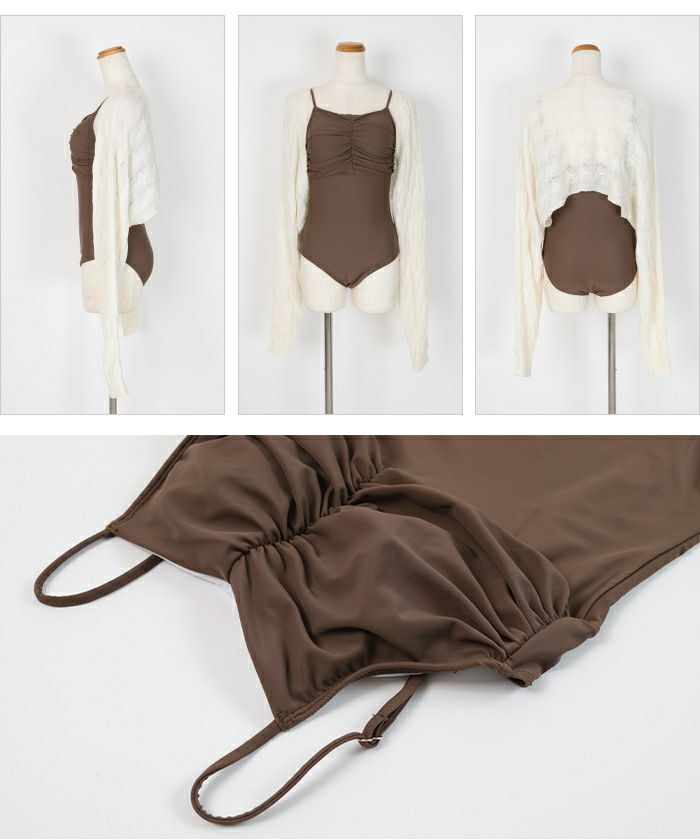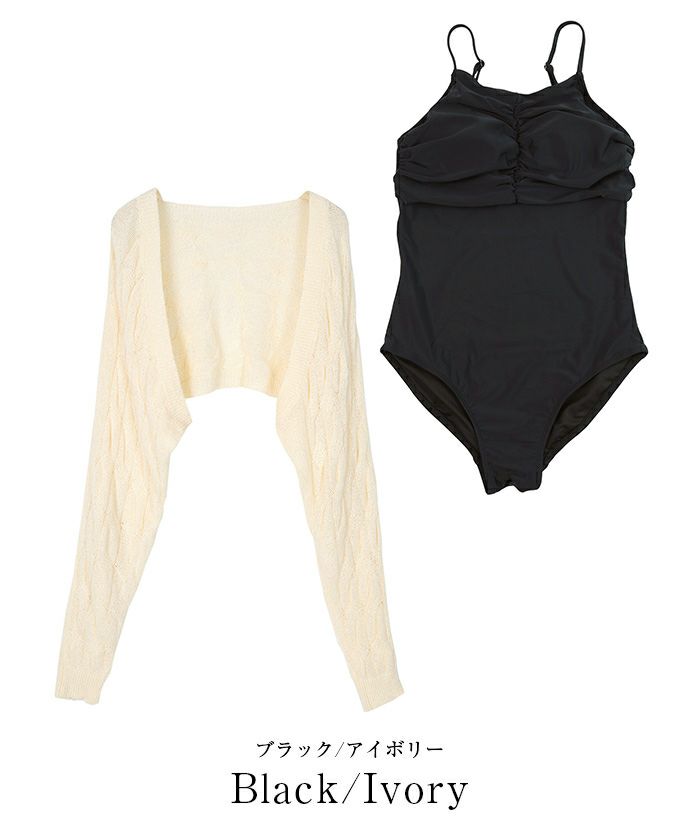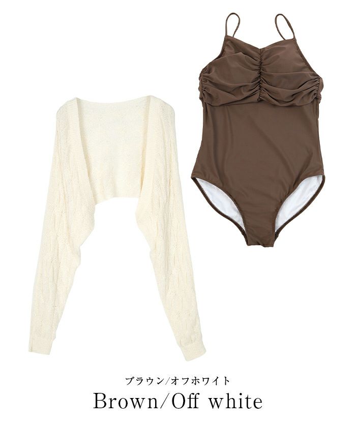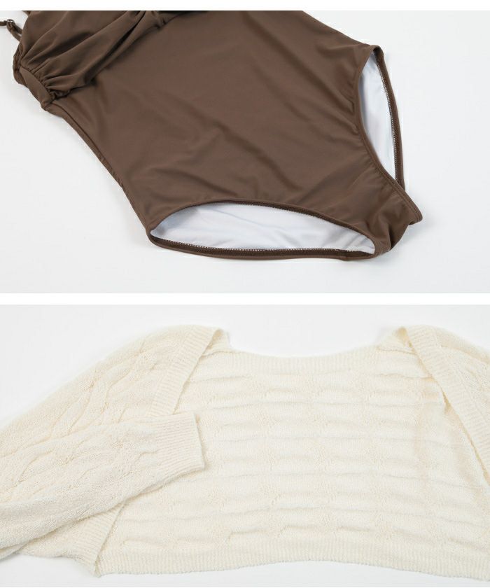 ・フロントギャザーワンピースとケーブル柄のサマーニットカーディガンがセットになっているリゾートスタイル水着。