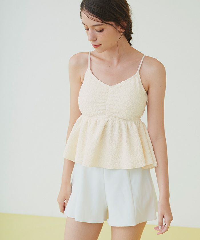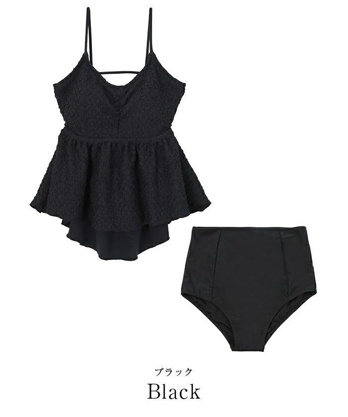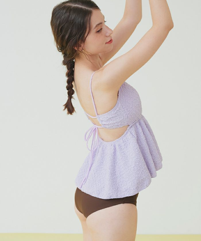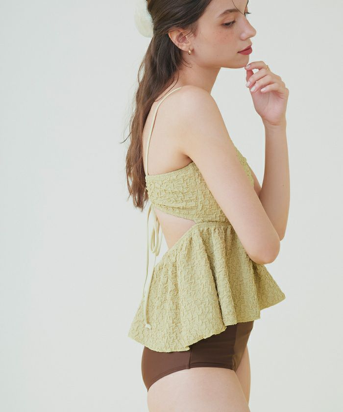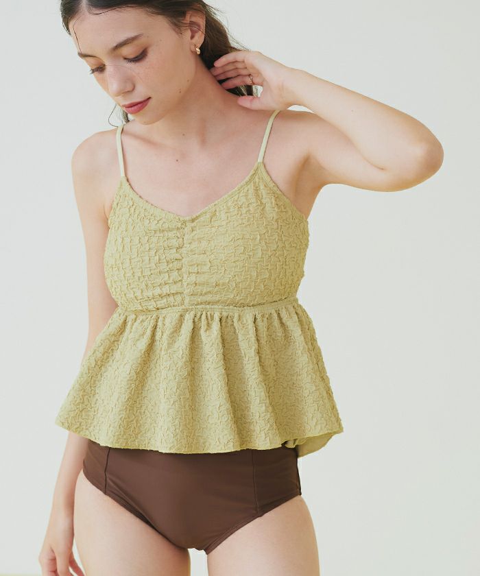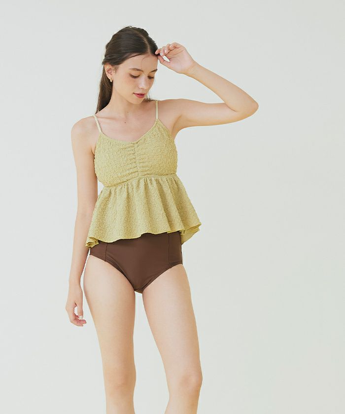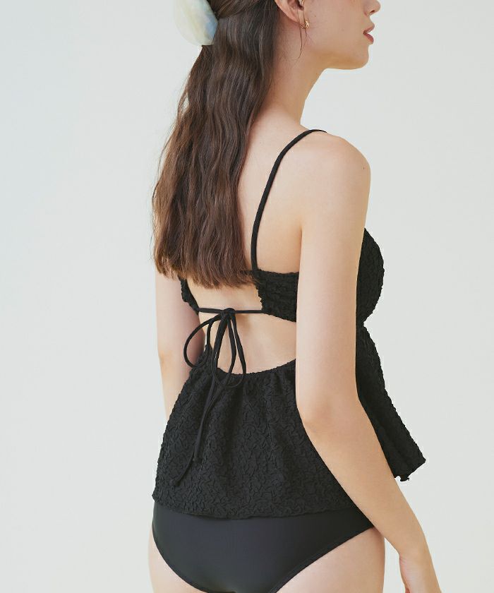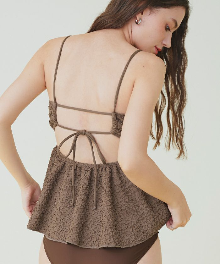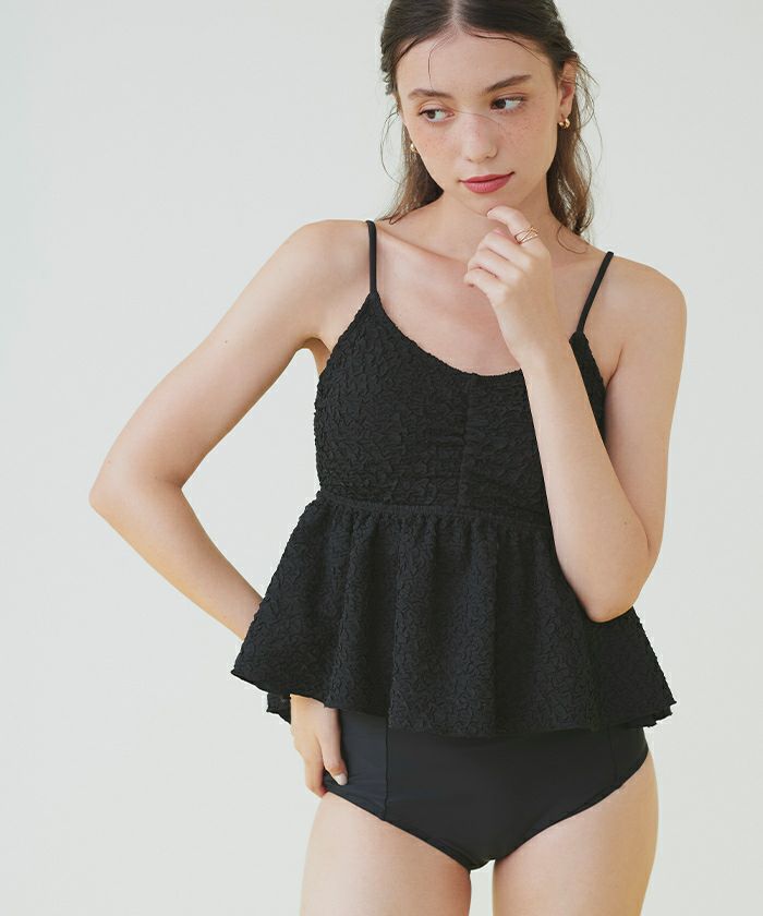 ・立体感のある素材が高級感あふれる大人可愛いペプラムデザインビキニ。