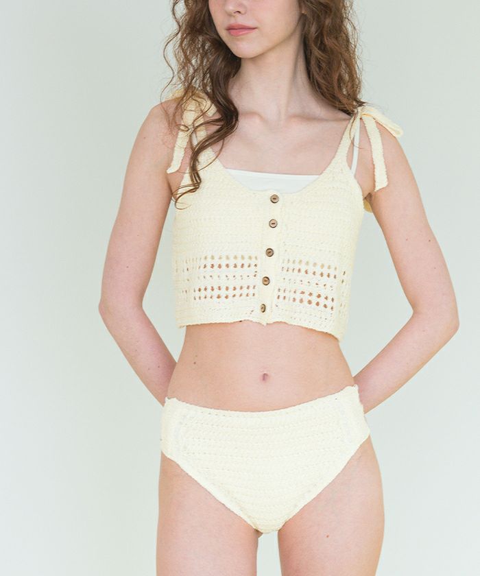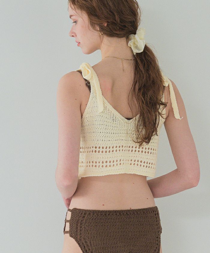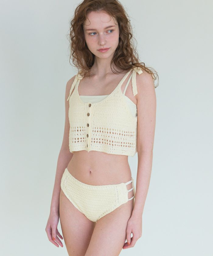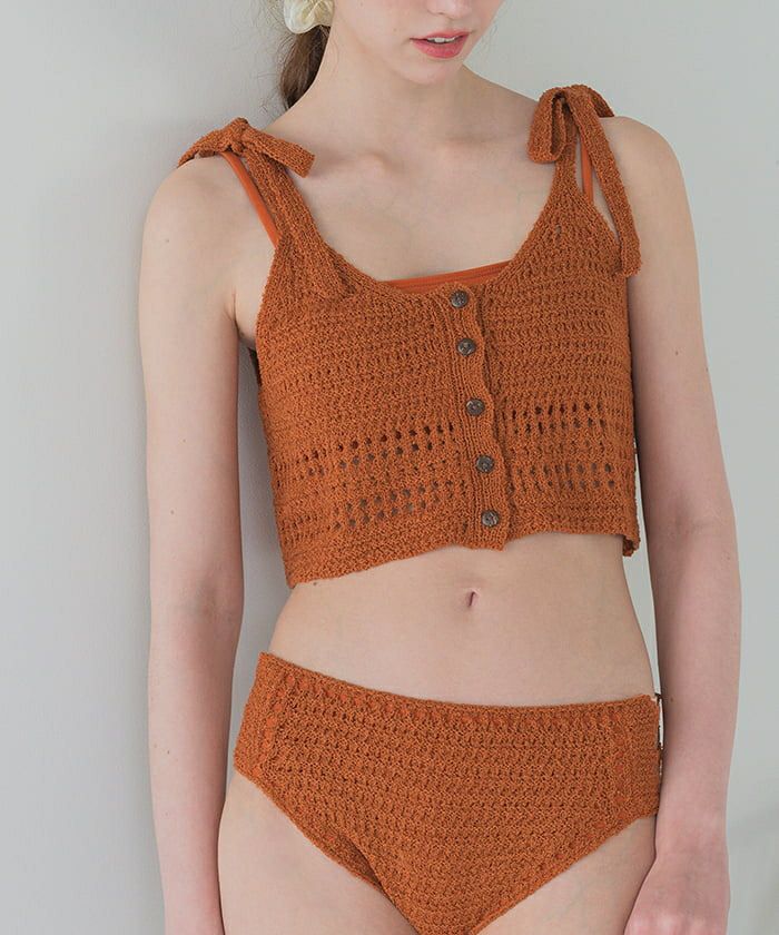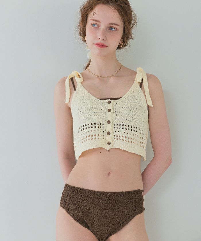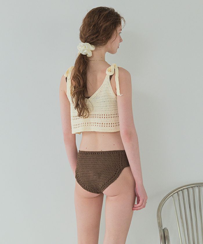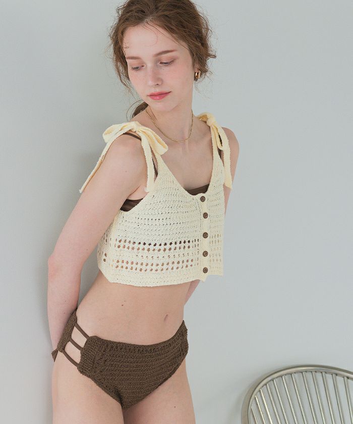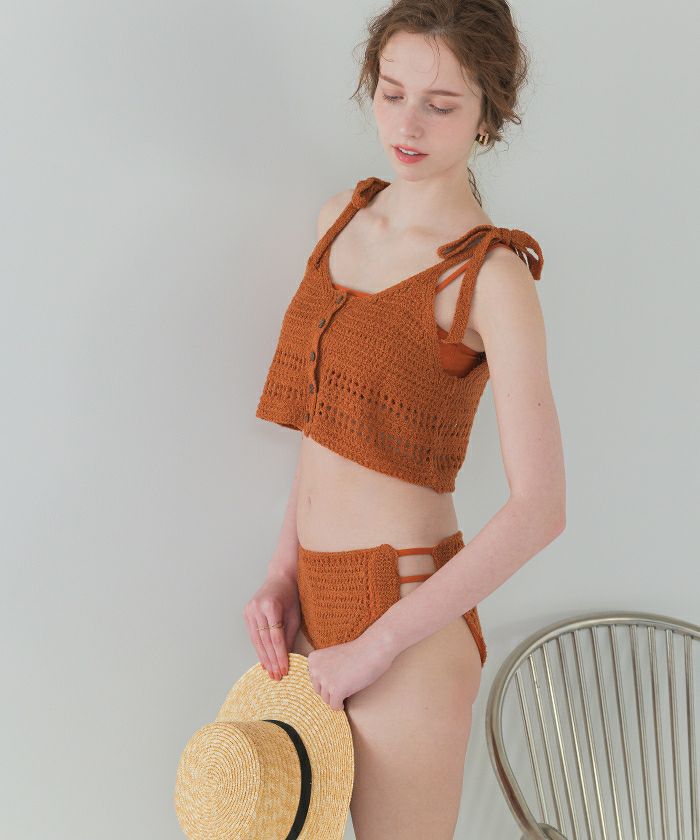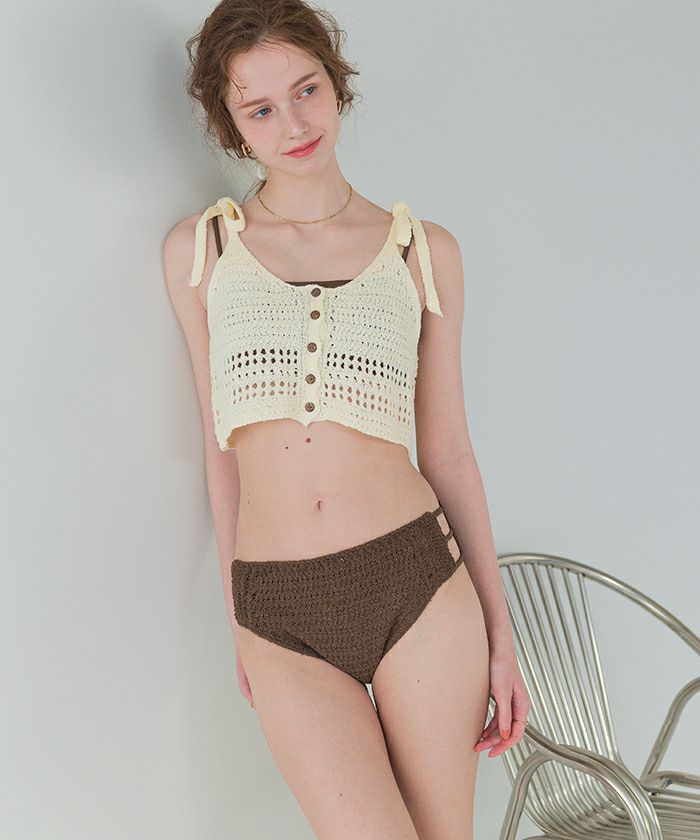 ・かぎ編みニットのショルダーリボンクロシェキャミソールが付いた3点セットビキニ。