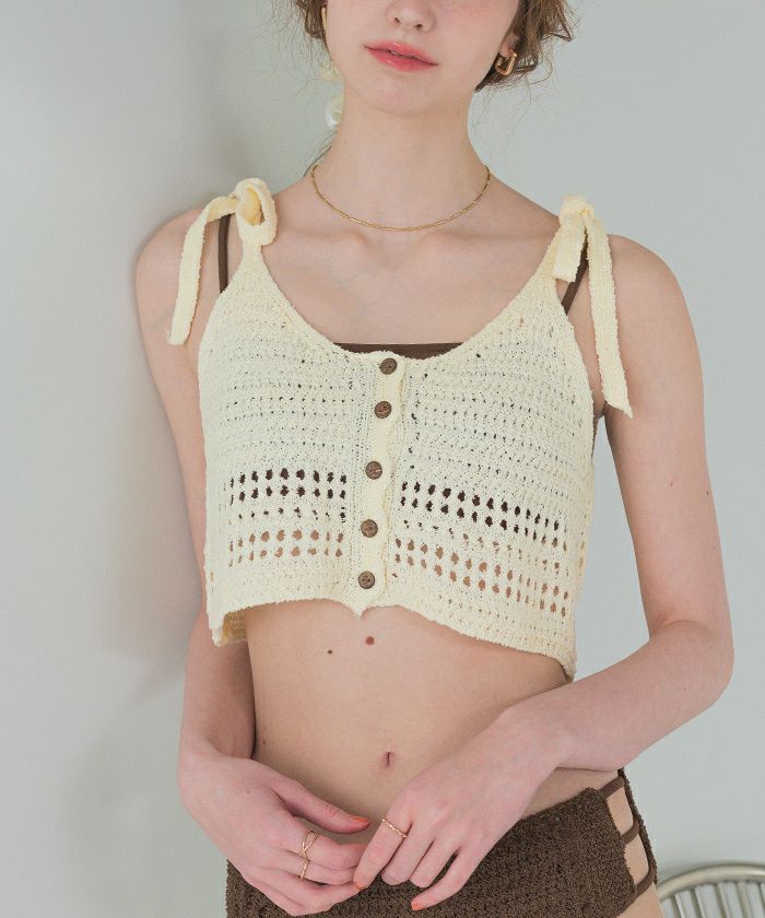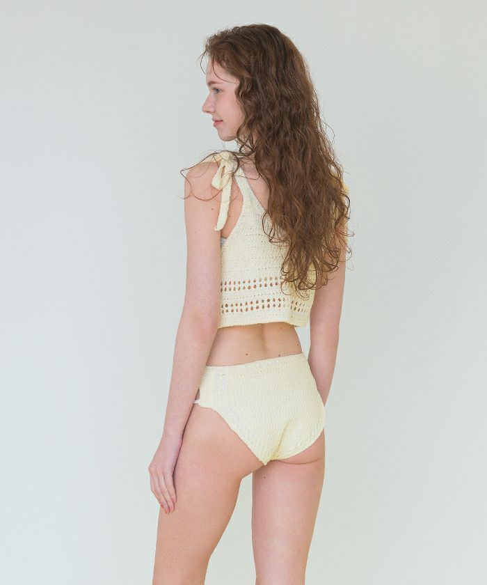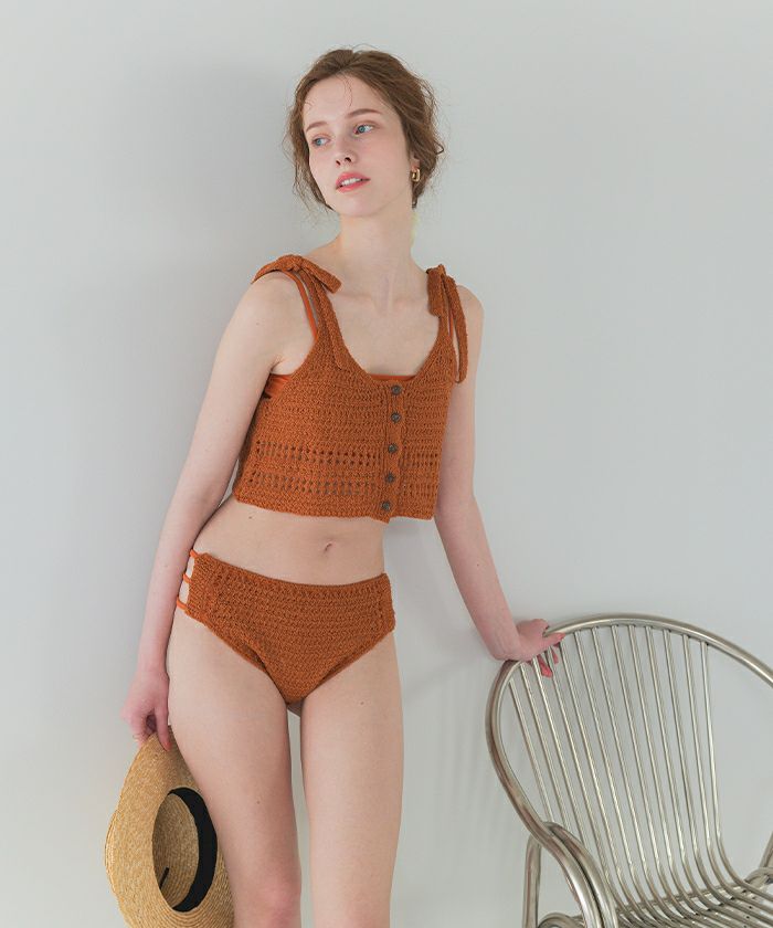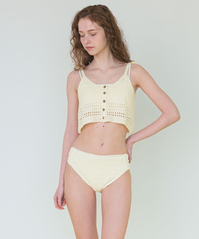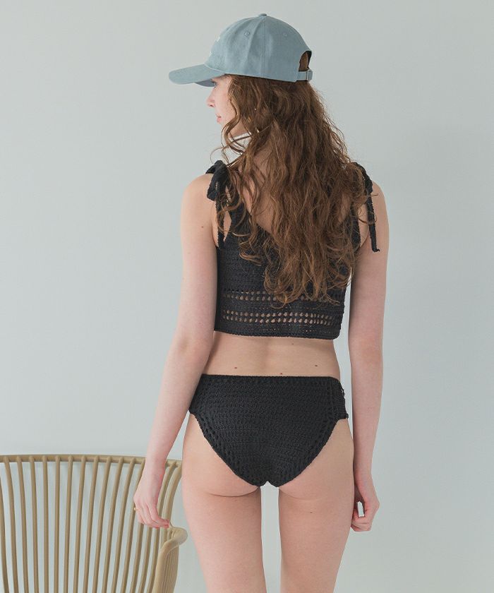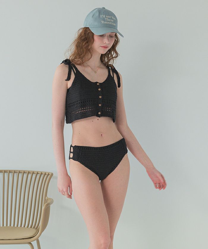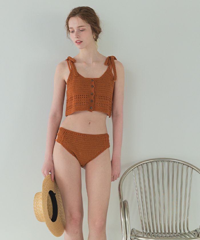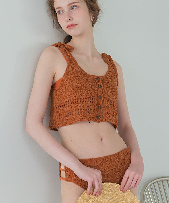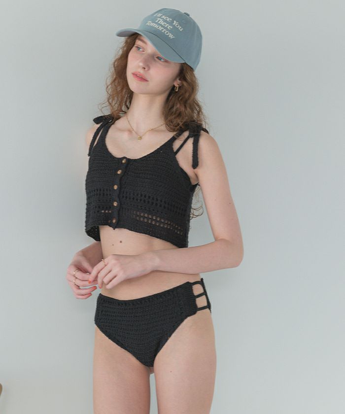 ・かぎ編みニットのショルダーリボンクロシェキャミソールが付いた3点セットビキニ。