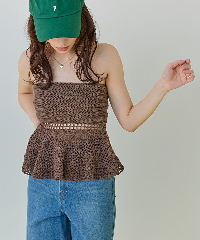 ・かぎ針編み特有の透け感が大人可愛いペプラムフレアデザインバンドゥビキニ。