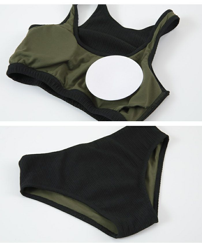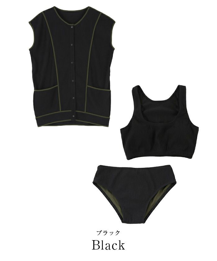 こだわりの素材と色使いがポイントのトップス、ラインがキレイに見えるシンプルビキニデザインの3点セットビキニ。